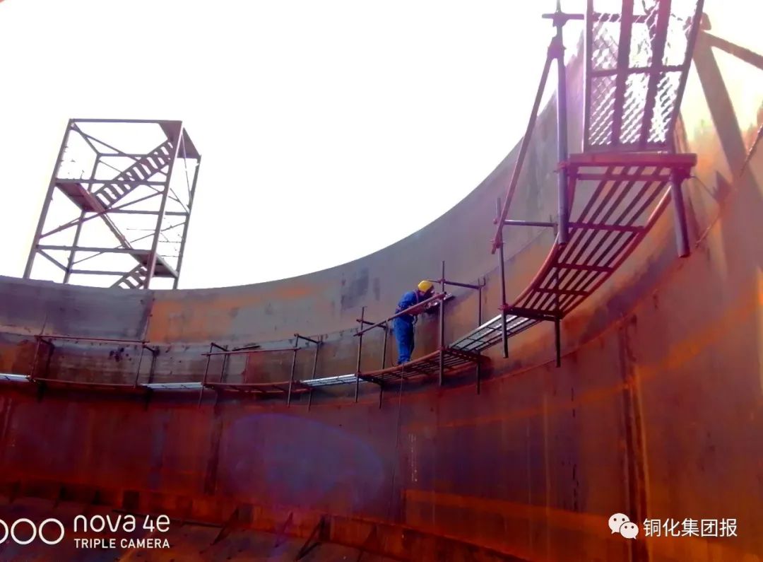 為促進礦山綠色發(fā)展,新橋礦業(yè)公司投資近2200萬元,對全尾砂充填系統(tǒng)進行技改。該工程于2月動工,預(yù)計7月底收官運行。屆時,選礦廠、選鐵廠生產(chǎn)尾砂及污水處理站淤泥經(jīng)混合處理可全部用于井下充填,實現(xiàn)礦山生產(chǎn)固廢零排放。圖為5月21日,工人正在施工現(xiàn)場焊接直徑18米的深錐濃密池?!√丶s記者/ / 朱常林/ / 攝